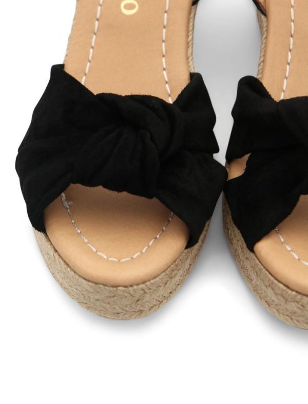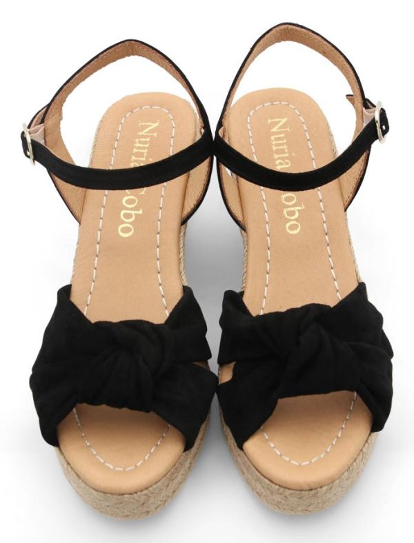 Alpargata cuña media más bonita de piel en color negro, forrada en piel y con planta también en piel, que garantiza suavidad y comodidad desde el primer paso. Está fabricada artesanalmente en España con una cuña de esparto natural. El diseño con lazo frontal y pulsera con hebilla al tobillo estiliza el pie y lo sujeta con elegancia, convirtiéndola en una opción ideal para acompañar tus looks con un toque sofisticado y femenino.
