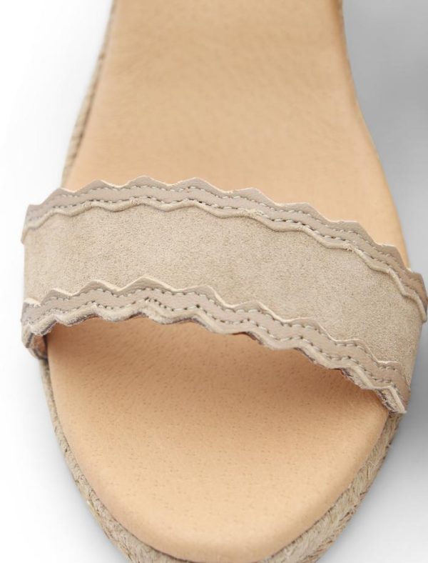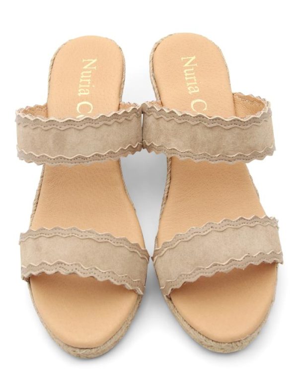 Alpargata de piel ante forrada en piel y con planta piel, fabricada artesanalmente en España. Tiene una cuña de esparto de unos cm. y plataforma delantera de cm. por lo que la inclinación del pie es de sólo cm , teniendo una gran sensación de comodidad.