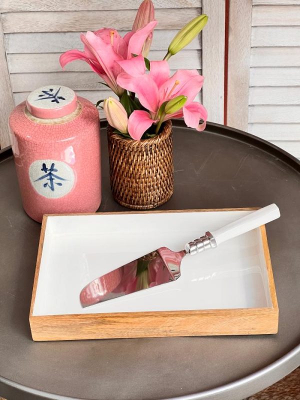 Exquisita bandeja de madera con un acabado esmaltado en blanco puro que aporta luminosidad y elegancia a cualquier espacio de tu hogar