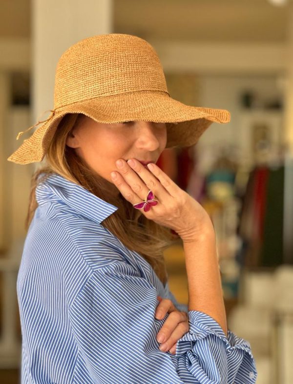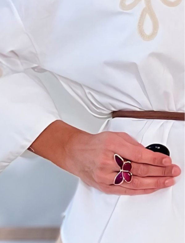 Anillo Mariposa Ideal con su diseño de mariposa en tono buganvilla lo convierte en un complemento delicado, con personalidad y muy favorecedor. La base dorada le aporta luz. Ideal para regalar o para darte un capricho. Combínalo con otros accesorios dorados o deja que brille solo.