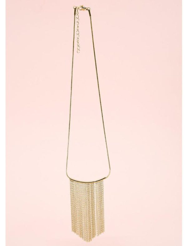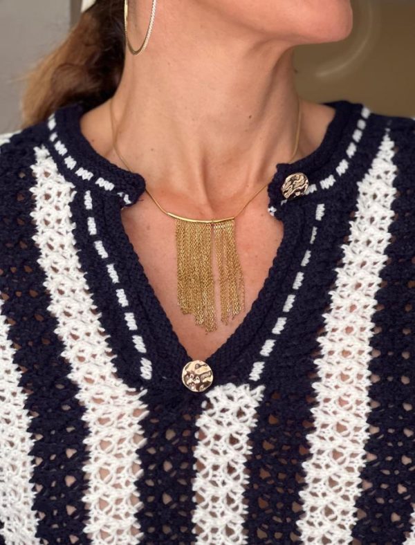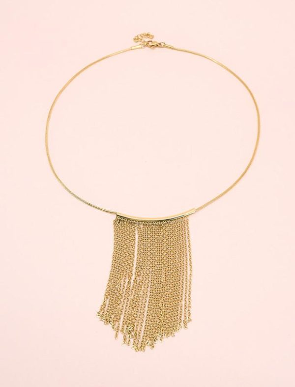 Gargantilla tipo collar de aro, fabricada en acero inoxidable bañado en oro. Incorpora flecos metálicos dorados que caen con movimiento ligero, añadiendo dinamismo y estilo. Cierre posterior con gancho ajustable para adaptarse con comodidad al cuello.