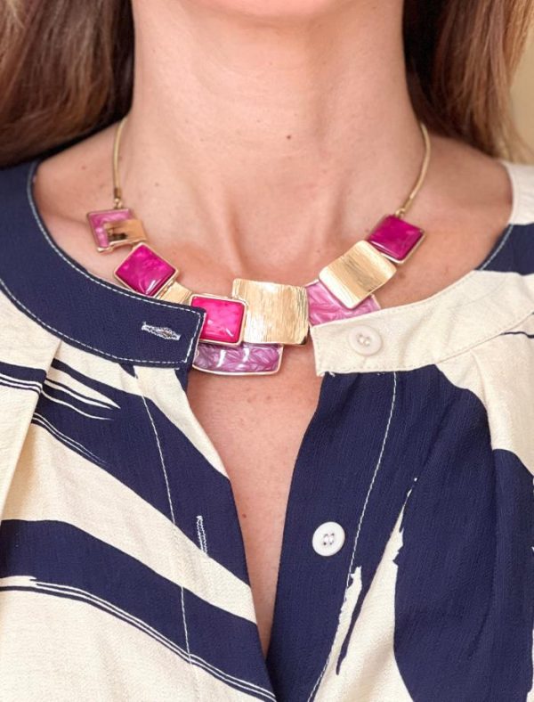 Gargantilla Joya Fresa está pensada para brillar sin excesos. Su estructura rígida en dorado y el conjunto de piedras geométricas en tonos fresa crean un contraste cálido y luminoso. Ideal para combinar con prendas lisas y escotes limpios.