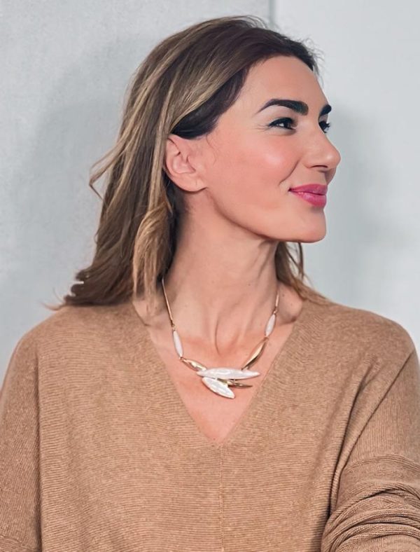 La Gargantilla Valerie está elaborada en acero inoxidable, lo que garantiza resistencia y durabilidad, y decorada con piezas de pasta nácar que aportan un brillo sutil y refinado. Su diseño y su cierre cómodo la convierten en una elección ideal tanto para el día como para la noche. Ideal para combinar con escotes abiertos o prendas lisas.