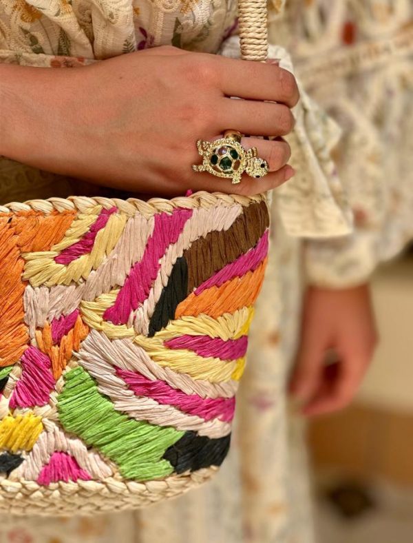 Bolso Chic Floreal Rosa tipo capazo pequeño, confeccionado en material natural con base trenzada y cuerpo con diseño en vibrantes tonos rosa, naranja, negro, verde y ocre. Incluye una asa larga (se puede quitar) y el interior está forrado tipo saco.