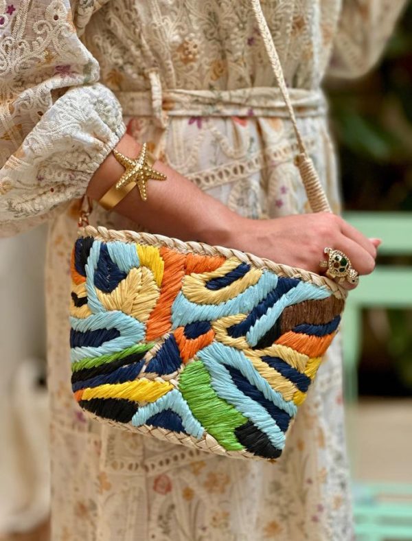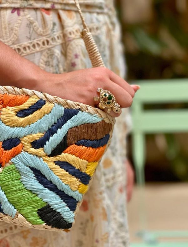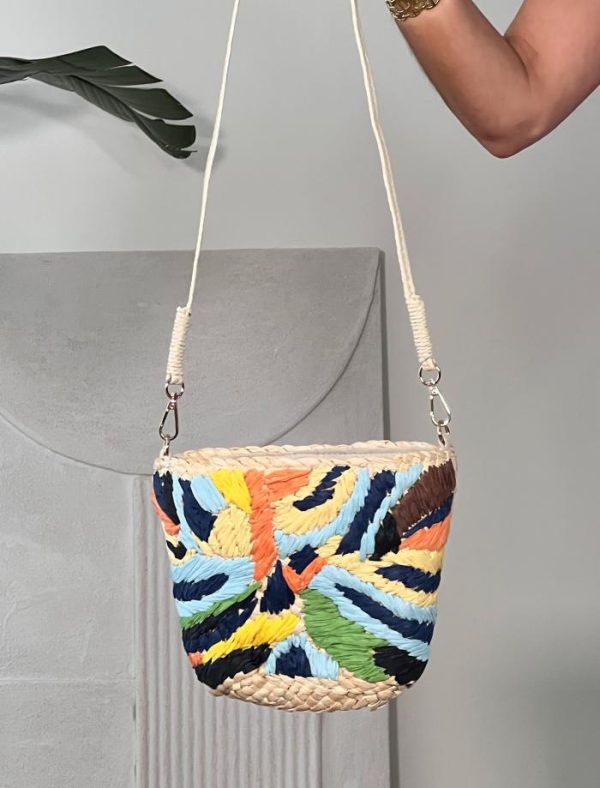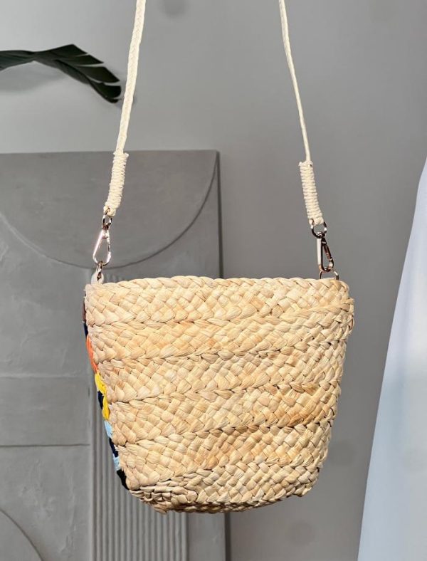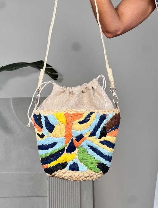 Bolso Chic Floreal Azul tipo capazo pequeño, confeccionado en material natural con base trenzada y cuerpo con diseño en vibrantes tonos azul, naranja, negro, verde y ocre. Incluye una asa larga (se puede quitar) y el interior está forrado tipo saco.