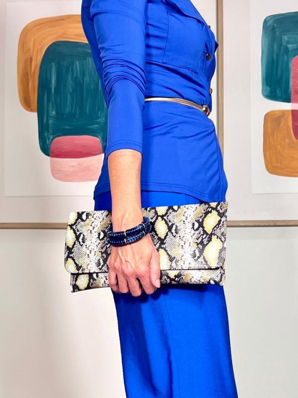 El modelo Dalia combina el grabado de serpiente con un formato cómodo y muy versátil. De día o de noche, suma fuerza a cualquier conjunto.