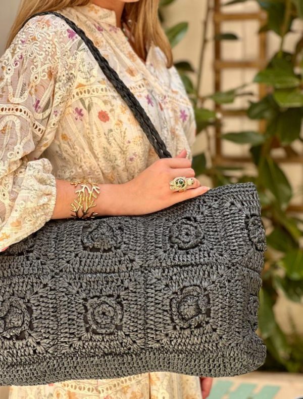 Bolso Shopper Negro, está elaborado en rafia natural con tejido trenzado y flores bordadas, con un interior completamente forrado en poliéster, lo que garantiza durabilidad y comodidad de uso. Su forma rectangular y sus asas largas lo convierten en un accesorio versátil y práctico para el día a día.