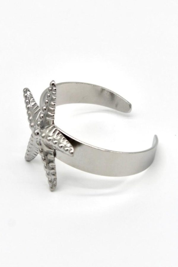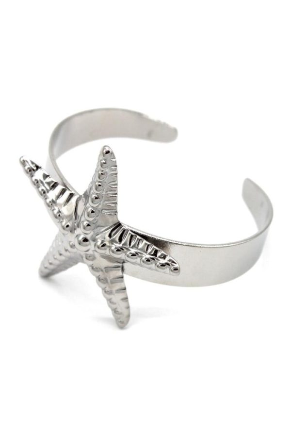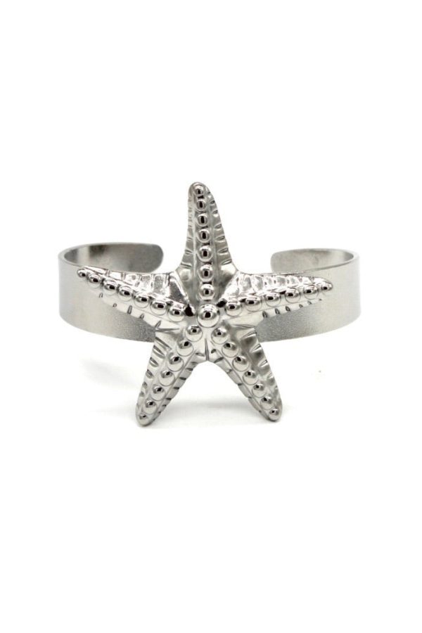 Elegante brazalete de acero inoxidable plateado con encantador adorno de estrella de mar que evoca la magia del Mediterráneo.