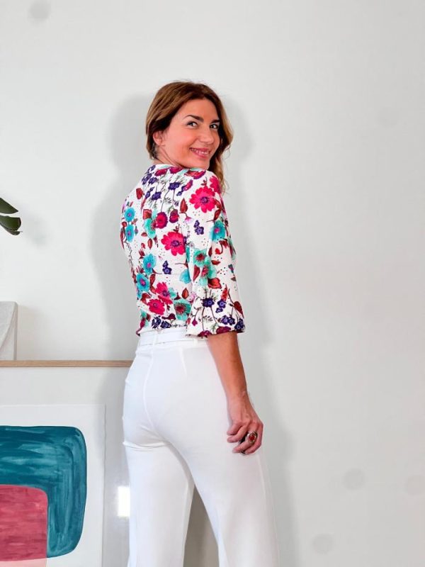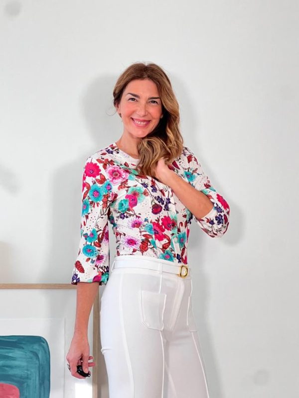 Camisa de punto elástico blanco con delicadas perforaciones bordadas y un estampado floral lleno de encanto. Su tejido suave y adaptable realza la silueta sin ceñirse en exceso, aportando comodidad y elegancia a partes iguales.