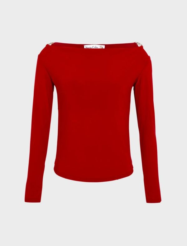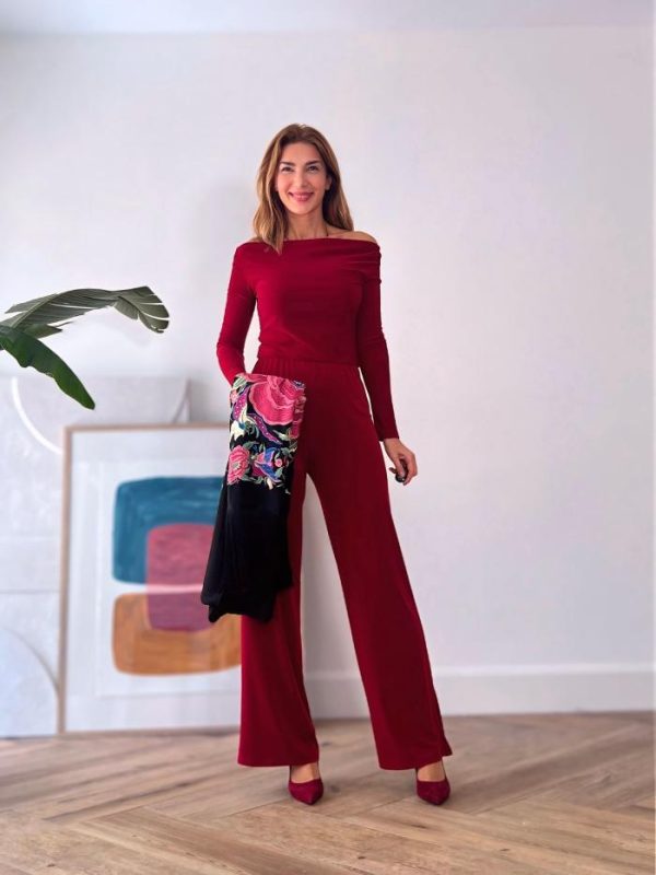 Cuerpo de punto elástico en color burgundy con aplique de cadena de eslabones en los hombros. Se trata de un “Made in Nuria” maravilloso, versátil y que es todo un fondazo de armario. Lo puedes combinar con el pantalón soft o cualquier otra prenda.