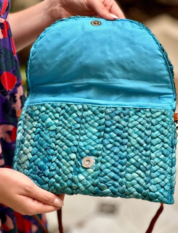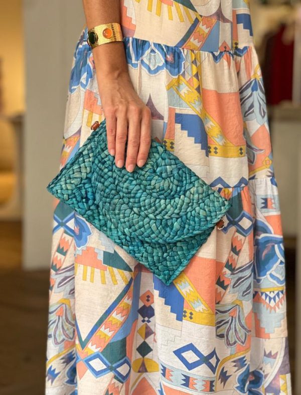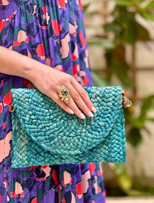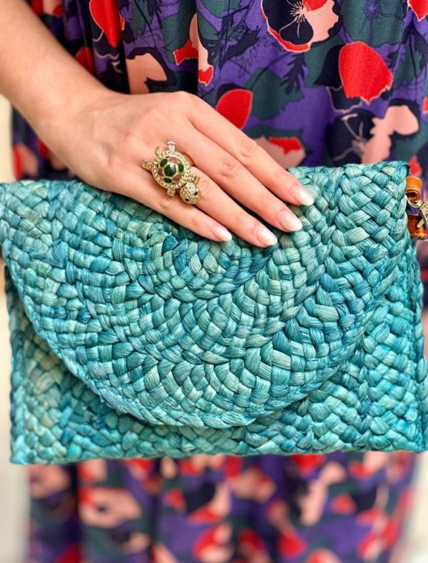 Cartera de mano natural ideal en paille de color azul vibrante, con una textura artesanal que aporta frescura y sofisticación.