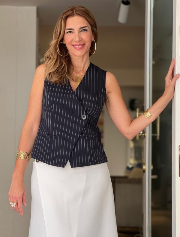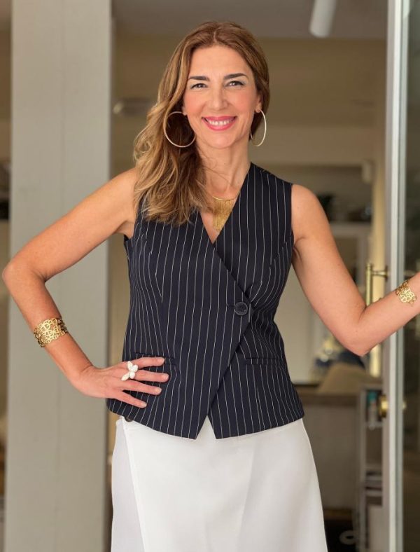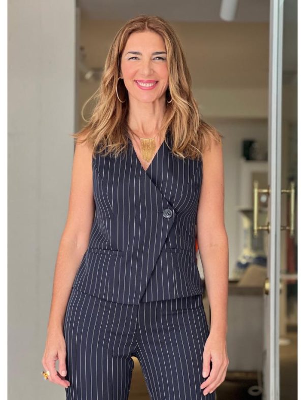 Chaleco de raya diplomática blanca en azul marino entallado con escote en pico y diseño sin mangas, que estiliza la figura y aporta un aire sofisticado a cualquier look. Ideal para combinar con su pantalón a juego o con faldas.