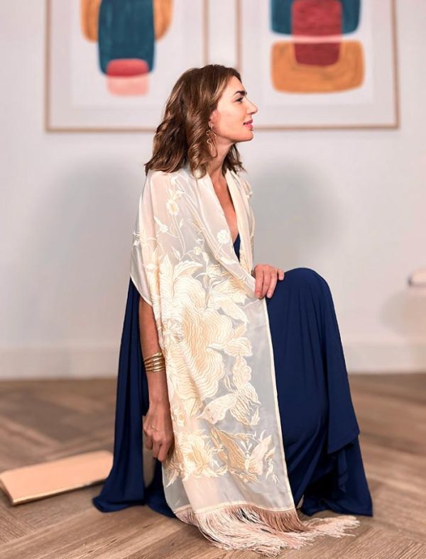 El Chal Bordado Maravilloso en color crema de la colección “Made in Nuria” es una pieza llena de luz, delicadeza y belleza. Su tejido vaporoso con bordados florales aporta un toque sofisticado, ideal para completar looks de invitada, vestidos lisos o conjuntos de ceremonia.