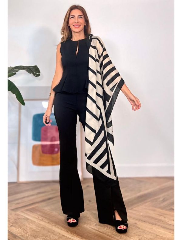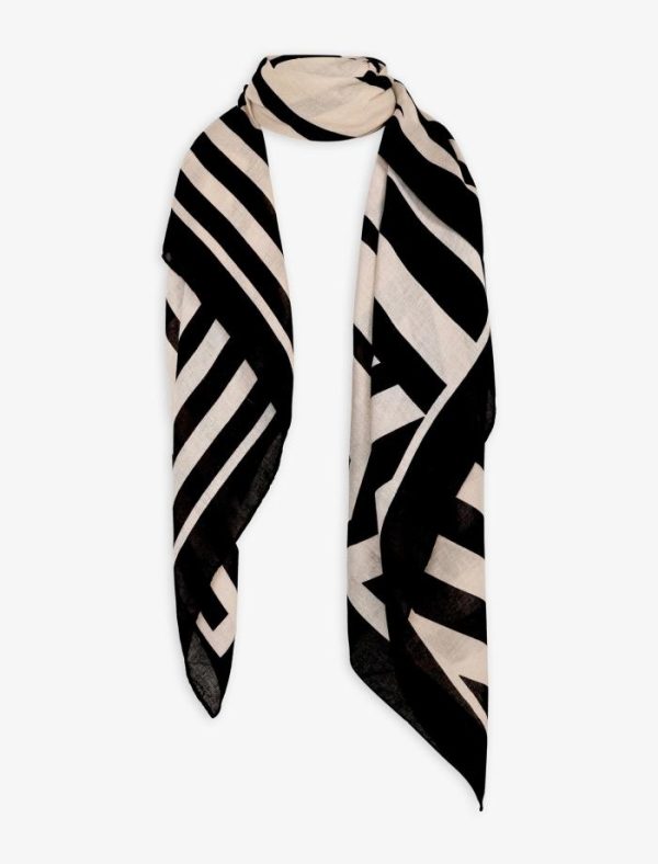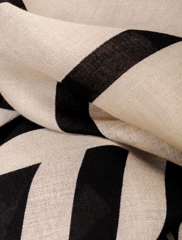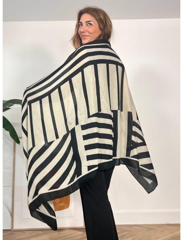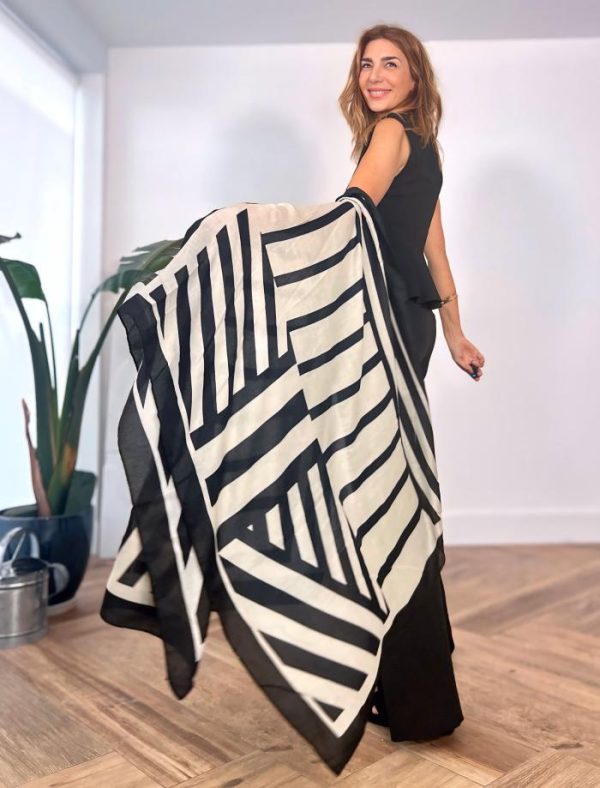 Foulard Suave Lines tiene un estampado de líneas negras sobre fondo crudo combina con todo y da fuerza visual a cualquier conjunto. Es suave, ligero y de tamaño generoso, ideal para llevar suelto, anudado o incluso como chal.