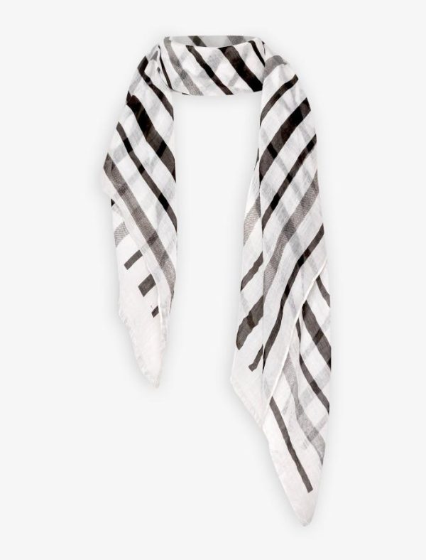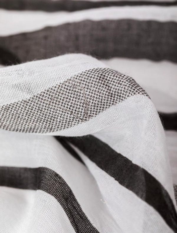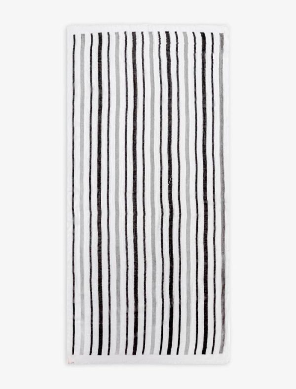 Este pañuelo de viscosa es ideal tanto como complemento de cuello como pareo en verano, tiene un suave dibujo en rayas blancas y negras, un accesorio atemporal y con mucho estilo.