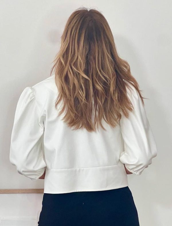 Chaqueta Blanca Muy Valentino minimalista, sofisticada y con ese toque de distinción que transforma cualquier look. Esta chaqueta luce una manga tres cuartos abullonada que aporta un encanto romántico y contemporáneo. Perfecta para crear conjuntos elegantes con vestidos, tops o blusas de corte femenino.
