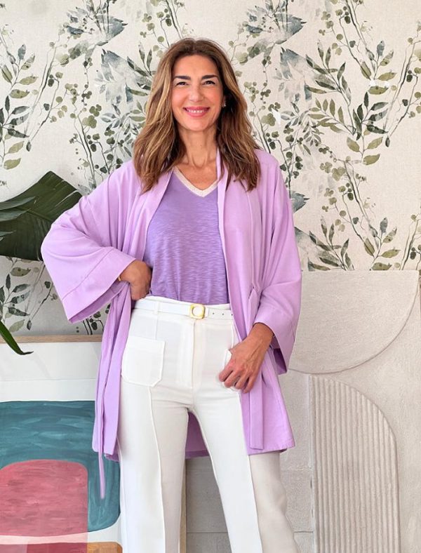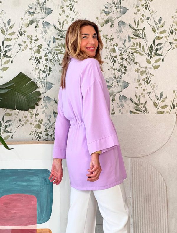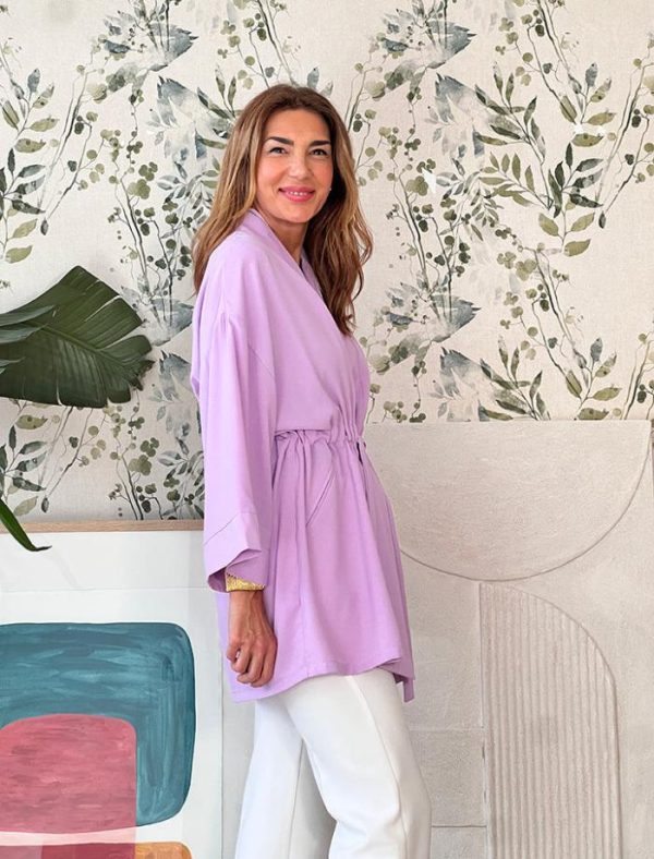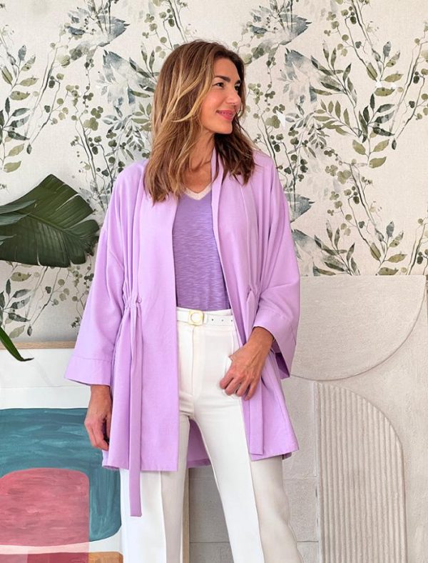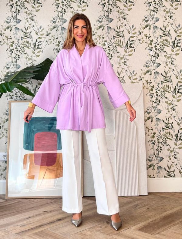 Chaqueta kimono en color lila, tiene un suave tejido fluido , se ajusta con un cinturón interior, con botones en los laterales, para mantener el ajuste, también la puedes llevar suelta o abrochada al centro tipo kimono.