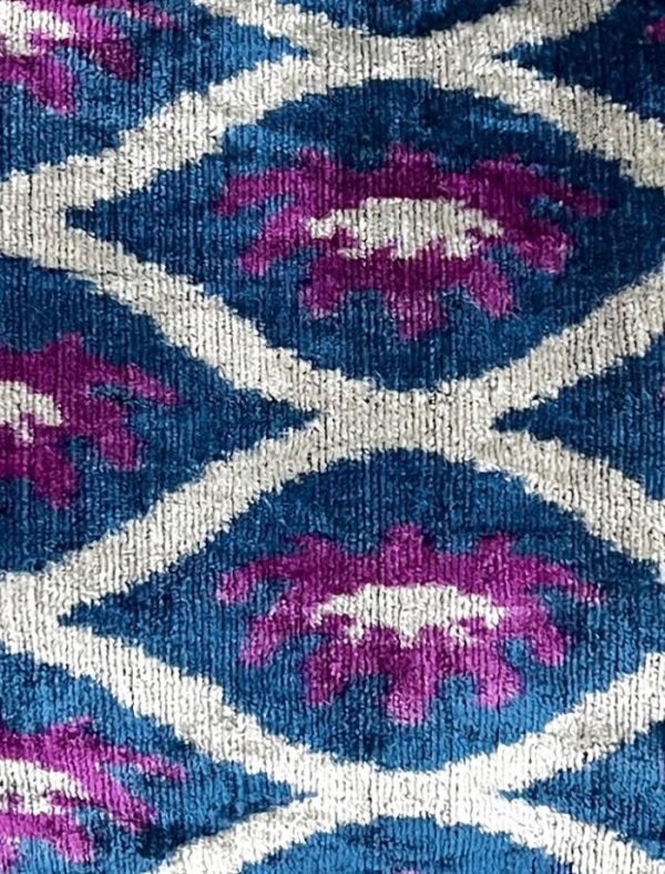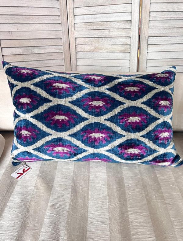 Descubre la elegancia artesanal de nuestro cojín con exquisita tela de terciopelo Ikat en tonos azules. El frontal presenta un lujoso terciopelo mientras la parte trasera luce un práctico algodón beige, completado con una discreta cremallera para mayor comodidad.