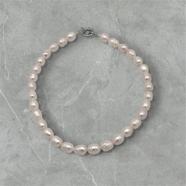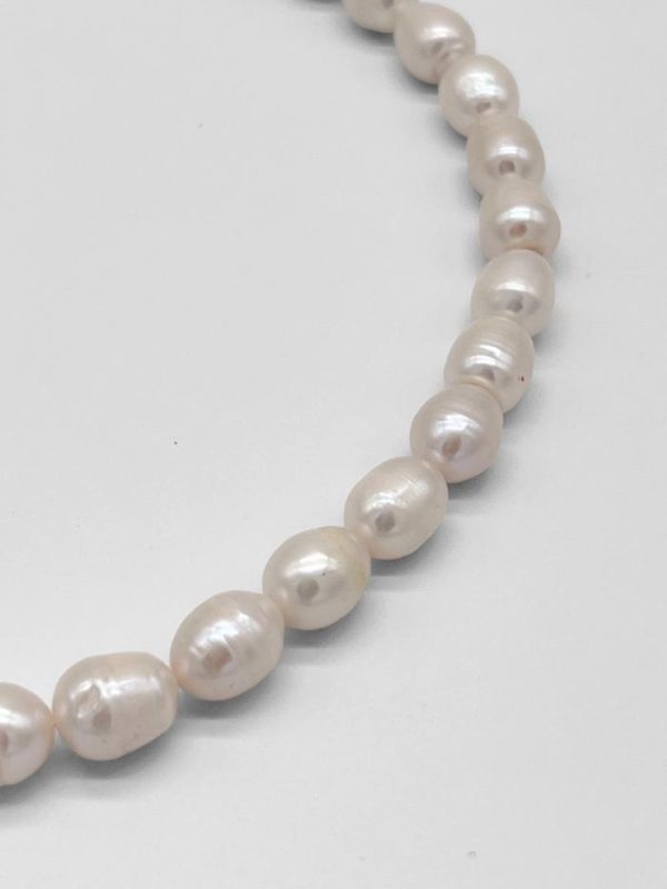 Elegante collar de madreperla natural con sofisticado cierre plateado de acero inoxidable que brilla con cada movimiento