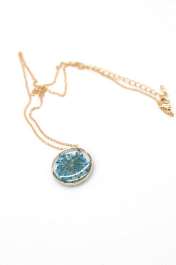 Elegante gargantilla de acero inoxidable en tono dorado con cierre seguro, luce un encantador colgante con pasta transparente que encierra una delicada flor azul en su interior. Perfecta para destacar sola con un toque de luminosidad o para combinar en capas con otros collares y crear looks únicos llenos de personalidad.