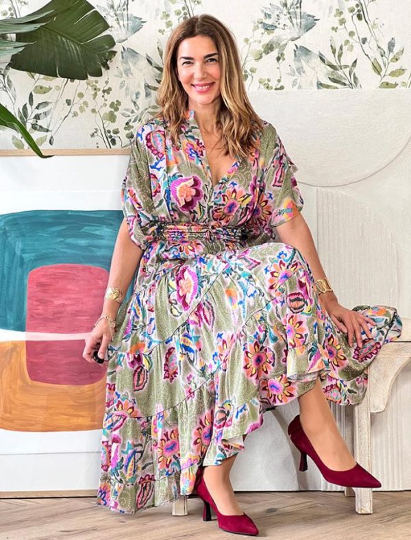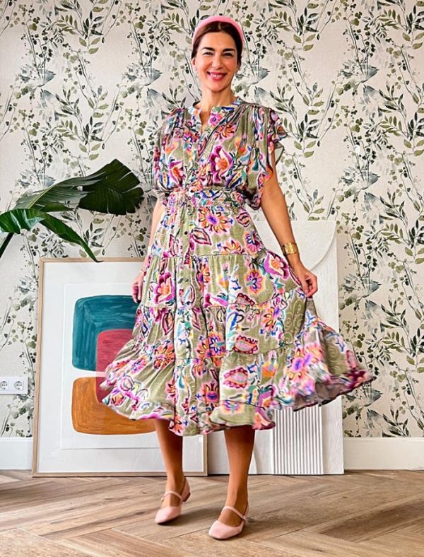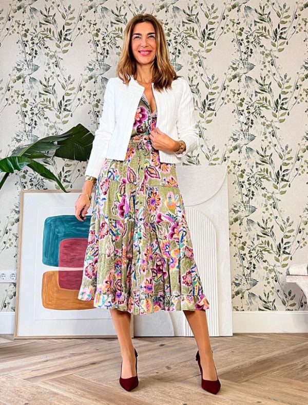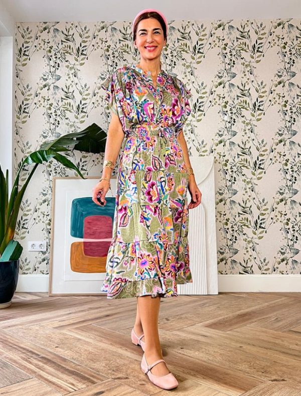 El total look perfecto para la primavera, por su fluidez , lo favorecedor que es y el maravilloso estampado del tejido, combínalo con unos tacones (en la foto Nuria ha elegido marsala, pero queda ideal también con nude o buganvilla) y una cartera y tendrás el conjunto perfecto para un evento. Transfórmalo con una bailarinas y dale un aire más informal para el día a día.