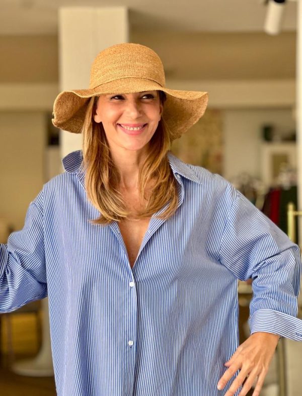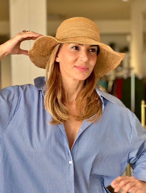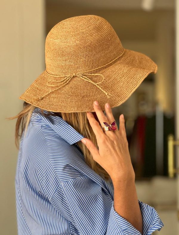 Sombrero Lazo Tostado de rafia natural hecho a mano presenta un diseño atemporal, con un lazo elegante y cinta interior ajustable, lo convierte en el complemento perfecto para los días de sol.