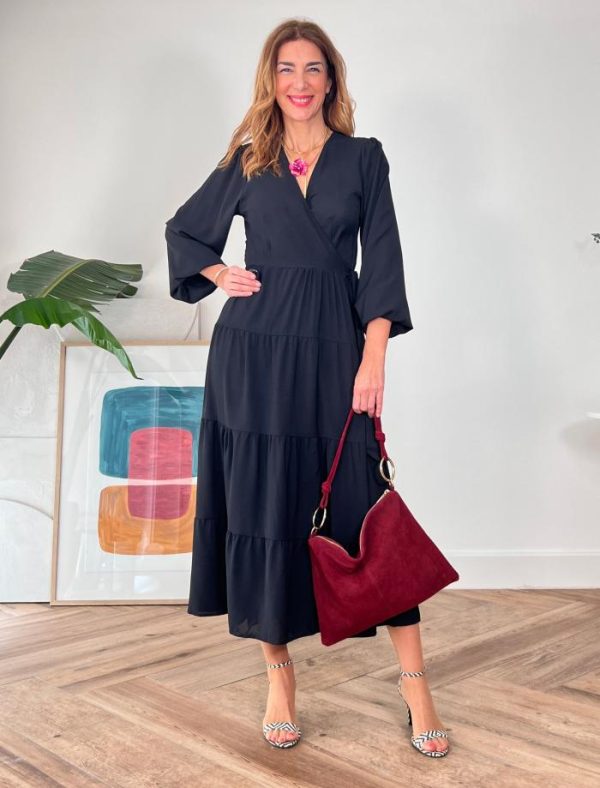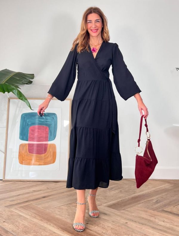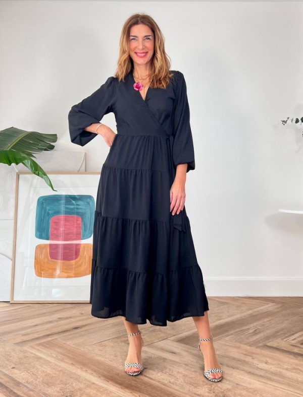 Vestido de corte fluido que se cruza delicadamente en la cintura creando una silueta favorecedora, se ajusta con elegancia mediante una cinta del mismo tejido que puedes anudar con estilo, luce un escote en pico sofisticado y una longitud versátil que combina a la perfección tanto con calzado plano como de tacón. Una pieza imprescindible que se convertirá en tu favorita para cualquier ocasión.