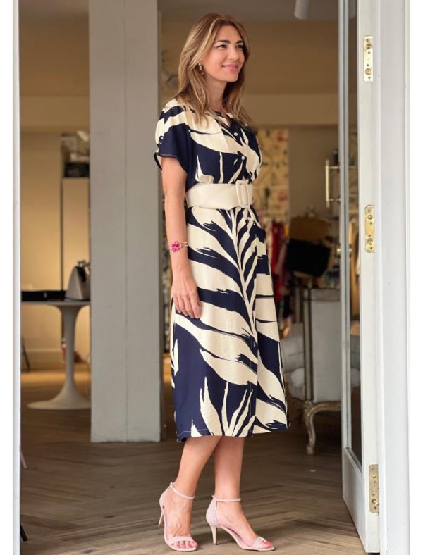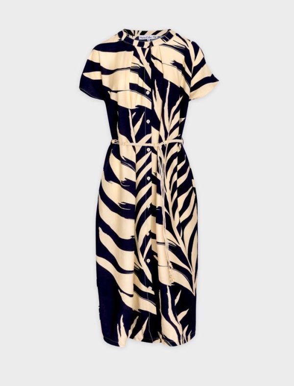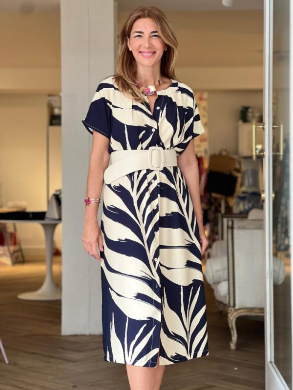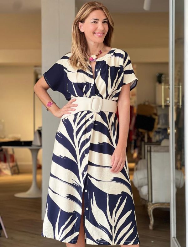 Vestido camisero azules con estampado en contraste y cinturón de cuerda incluido. Una prenda favorecedora y fresca, perfecta para los días cálidos, que combina comodidad y estilo en un solo gesto.
