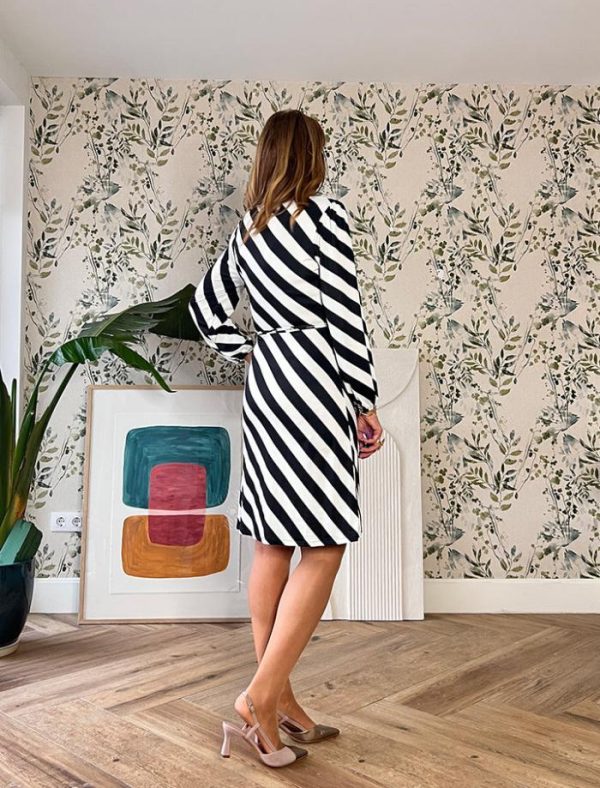 Se ajusta facilmente mediante una cinta del mismo estampado, especialmente estilizador por el trazo del dibujo de las rayas.