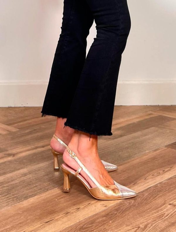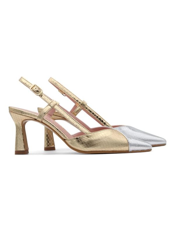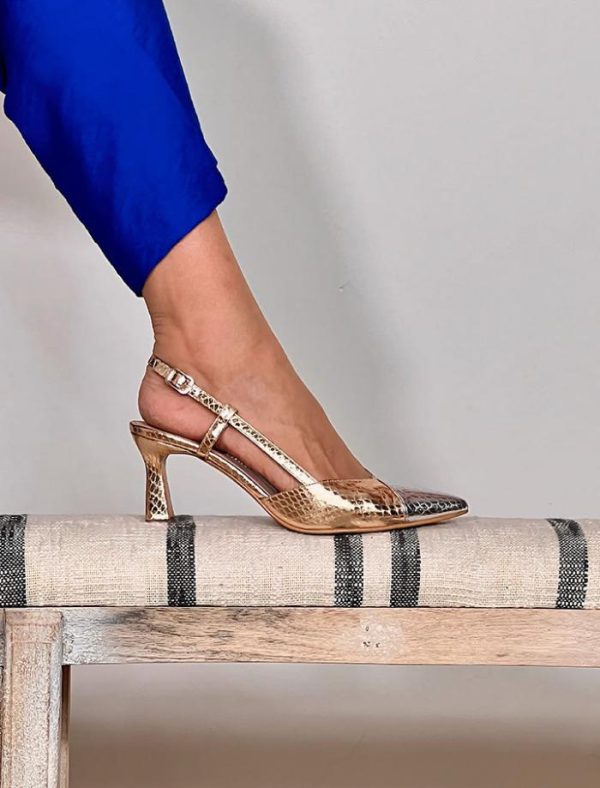 Este salón destalonado con una tira ajustable que sujeta a la perfección el tobillo, además de ser superelegante esta pensado para calzarlo muchas horas con la máxima comodidad, el ajuste de la posición del tacón al centro del talón hace que el pie descande perfectamente, tiene además plancha acolchada y un piso de goma ultraflex que facilita y da comfort a cada paso.