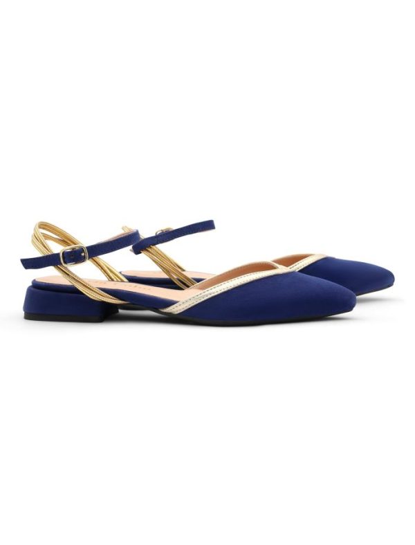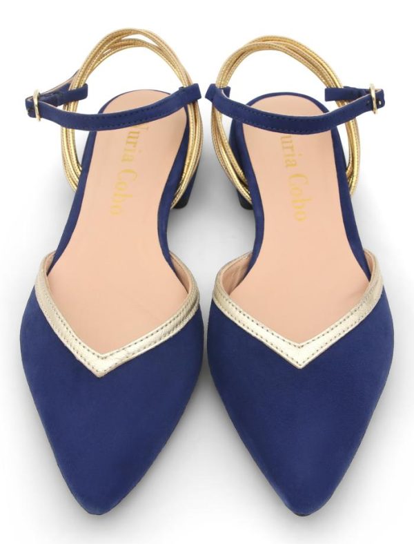 Rosita marino, zapato plano tipo destalonado de punta, fabricado en piel color azul marino. Destaca por su ribete de piel dorado, aportando contraste y luminosidad.