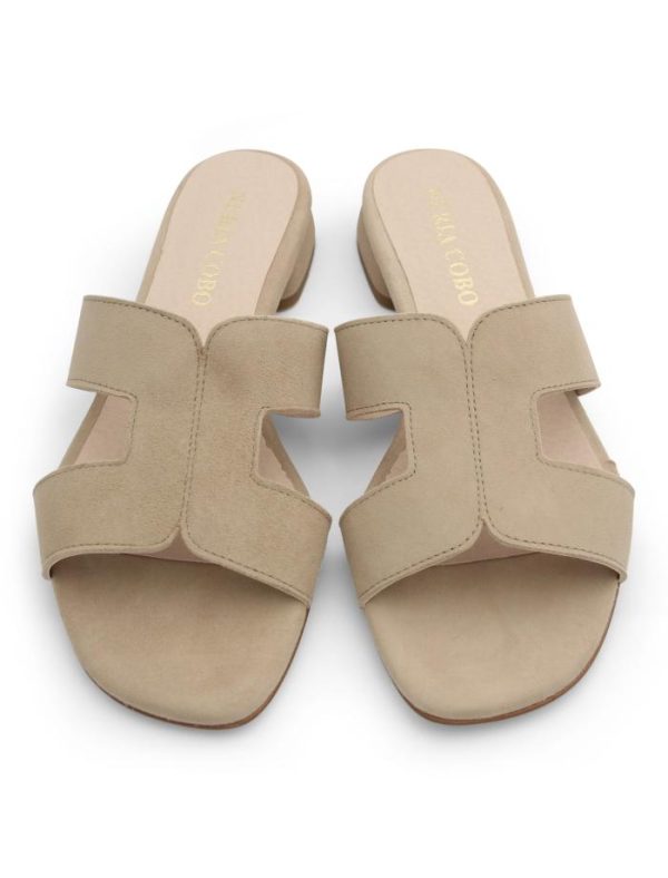 Sandalia plana beige para muy cómoda en piel y forro interior piel fabricada en talleres artesanales españoles, tiene un pequeño tacón de 1,5 cm aproximadamente , piso de goma y planta suave.Sujeta de maravilla el pie y queda muy estilosa.