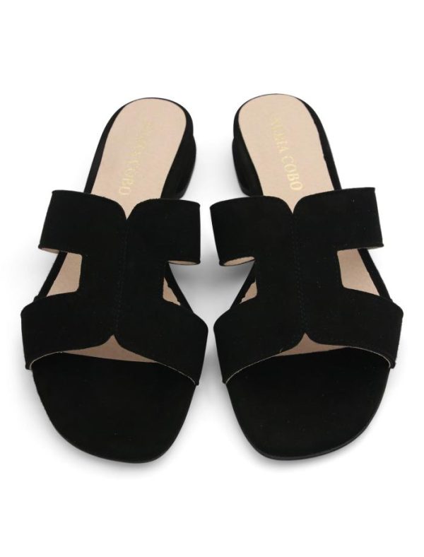 Sandalia plana negra muy cómoda en piel ante y forro interior piel fabricada en talleres artesanales españoles, tiene un pequeño tacón de 1,5 cm aproximadamente , piso de goma y planta suave.Sujeta de maravilla el pie y queda muy estilosa.
